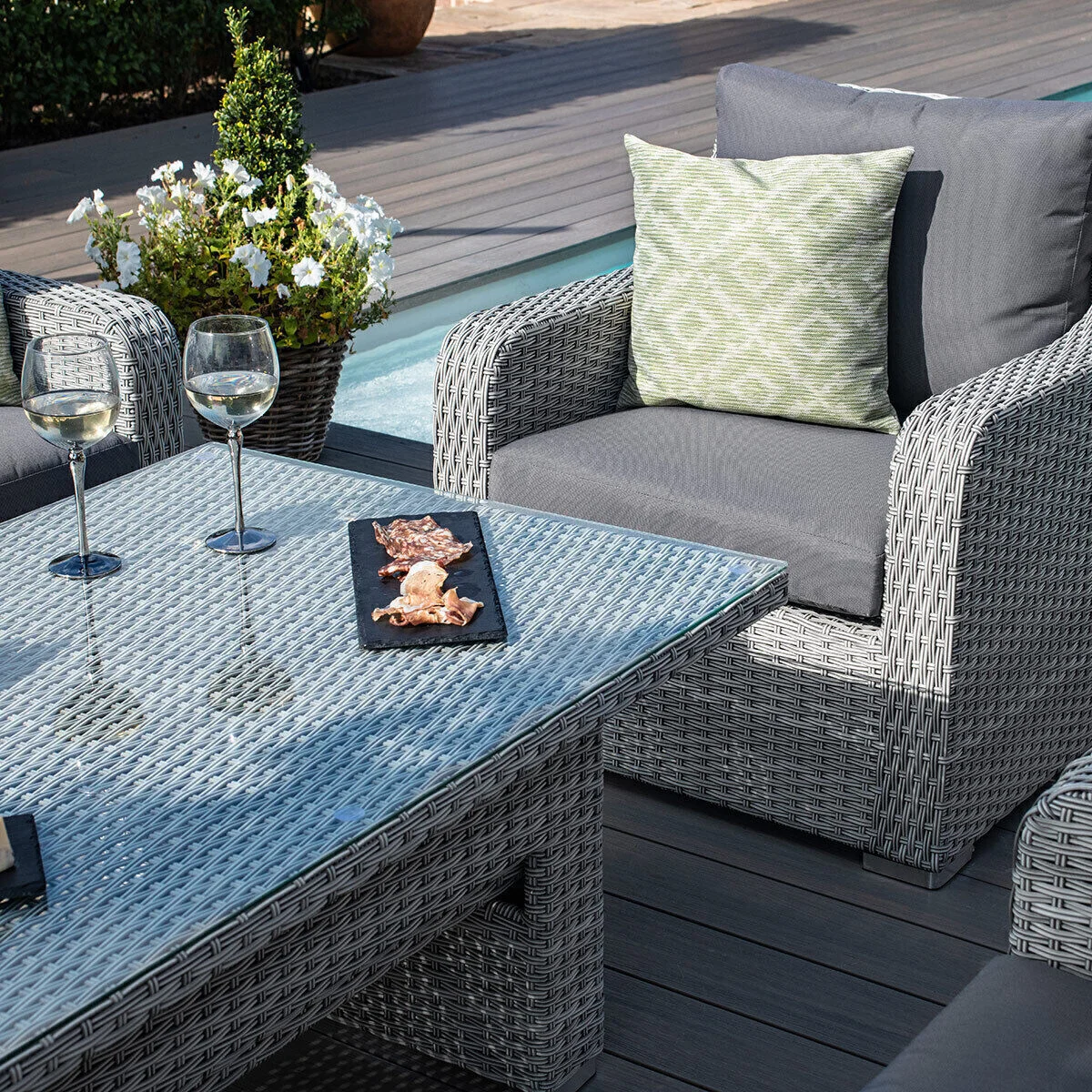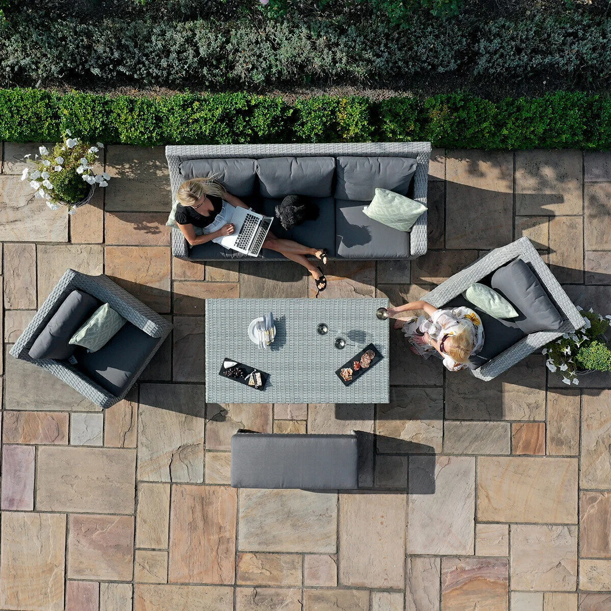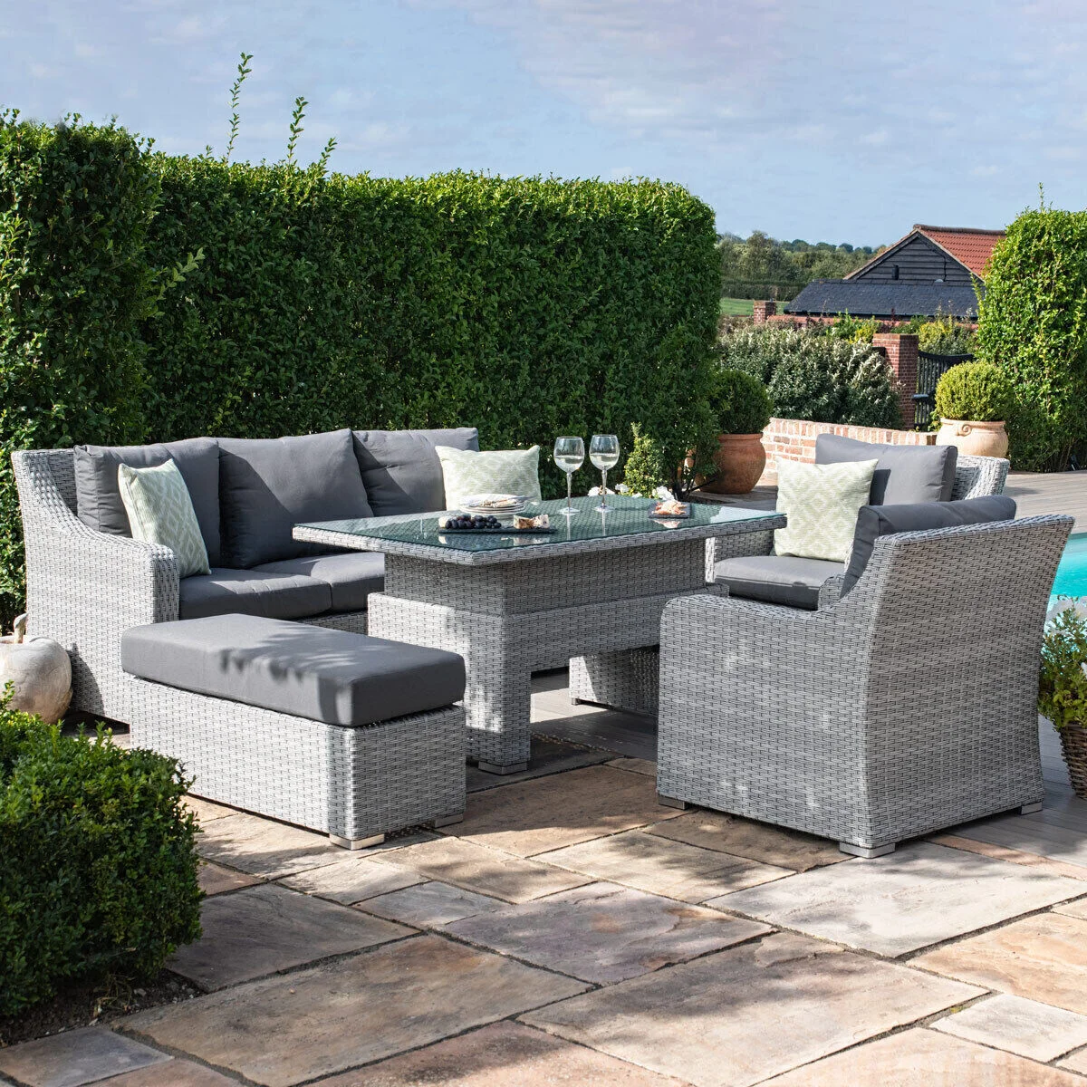 Ascot 3 Seat Sofa Dining Set with Rising Table considers the smaller outdoor living space whilst offering the option to move from day-time lounging to evening alfresco dining. The square rising table simply lifts from coffee to dining table positions teamed with the popular corner sofa group, and long footstools to maximize use and seating space.